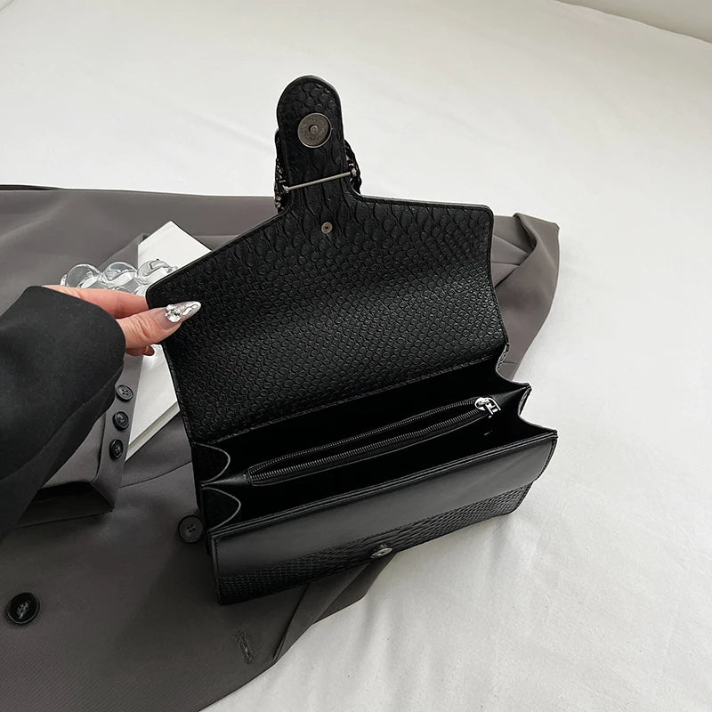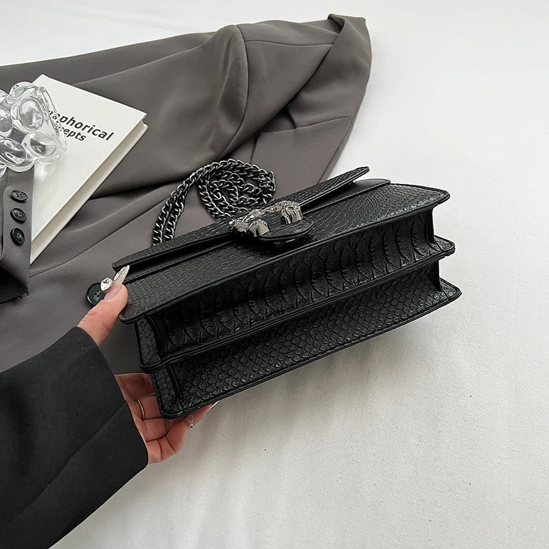 Strike hard with the Y2K Snake Print Bag from Y2K Stylee — a structured, serpentine statement piece made for fearless fashion. This square-shaped shoulder and crossbody bag features a textured snake pattern on PU leather, finished with a sleek metal chain strap and secure zipper closure.